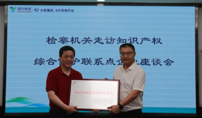 近日,重慶市人民檢察院第一分院黨組成員、副檢察長李榮成,沙坪壩區(qū)人民檢察院黨組書記、檢察長程權(quán)一行來到重慶市人民檢察院第三批“知識產(chǎn)權(quán)綜合保護(hù)聯(lián)系點(diǎn)”企業(yè)西南藥業(yè)股份有限公司,為西南藥業(yè)股份有限公司和重慶水泵廠有限責(zé)任公司授牌,并與企業(yè)展開座談交流。西南藥業(yè)黨委書記、執(zhí)行董事、總經(jīng)理鮮亞及部分領(lǐng)導(dǎo)班子成員參加接待。